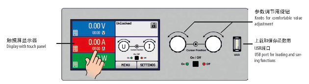 設(shè)定與實際輸出電壓、電流與功率都清晰顯示于圖形顯示器上。彩色的TFT屏幕為點觸式,用一個手指就能控制所有功能。